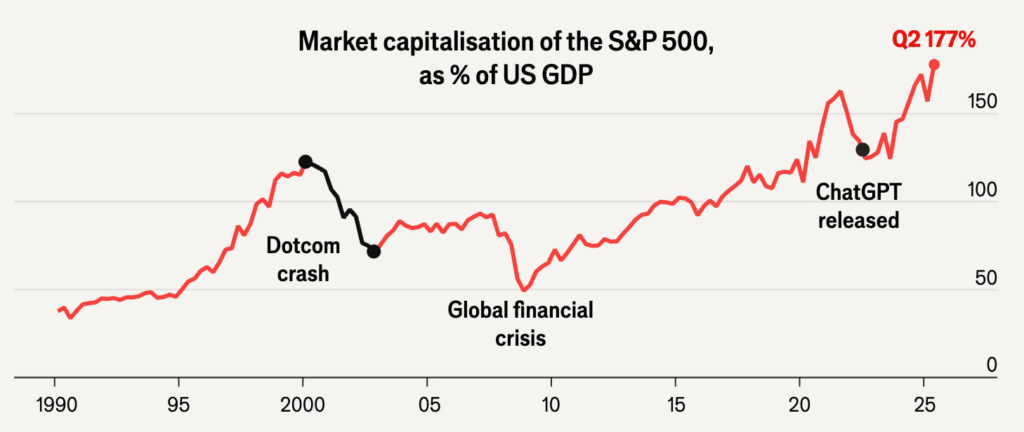 표에서, 2000년 dotcom 붕괴로 지수가 76% 떨어졌어요. 그 당시를 살았던 나를 비롯한 노인네들이여, 기억하시죠 Cisco, Yahoo 와 와 와 IT 정보통신 이름만 붙여 pet.com, boo.com, eToys.com, iloveschool.com 도메인만 만들어봐 뭐든지 다 사주마 했는데 결국 아마존 이베이 정도만 남고 나머지는 나락으로 돌진했지요. 그런데 ChatGPT가 등장하여 시장을 뒤흔든 24년 무렵부터도 비슷한 양상이 전개되는 것 같다고 일부 금융 전문가들이 예의주시하고 있대요.