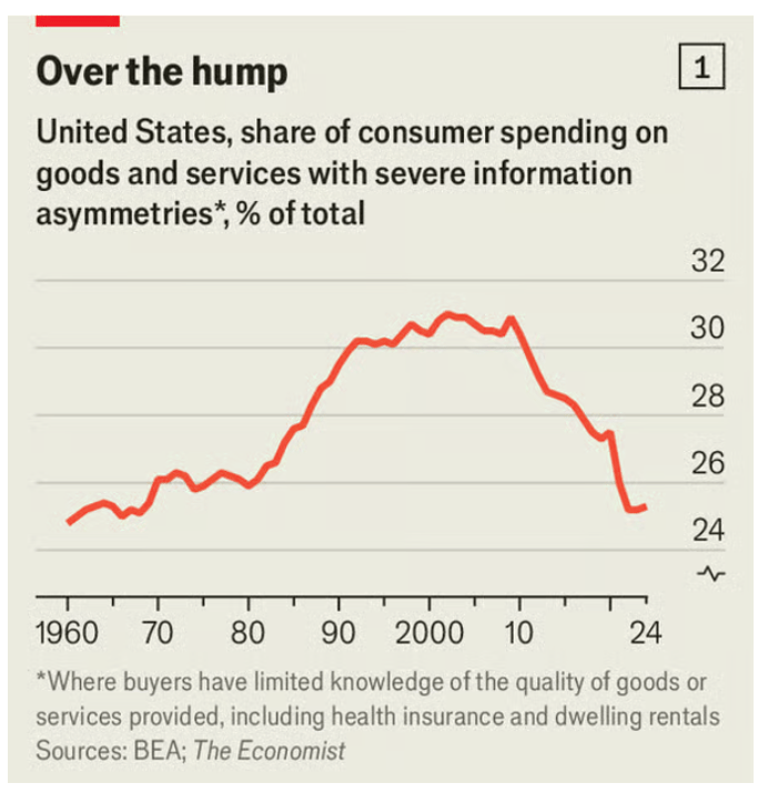 위 표는 미국 예로, 재화와 서비스 소비에 있어서 소비자 측면의 정보 비대칭 비율이 10년전에 비해 크게 줄어들고 있음을 보여줍니다. 이와 관련, 경제학 용어로 중고 자동차 “레몬” 이론이라는게 있는데, 소비자 입장에서는 중고차가 제대로 된 놈인지 아님 그 속에 레몬 집어넣은 똥차인지 알 수가 없으므로 일반적으로 저품질을 각오하게 되며, 이런 논리로 판매자 중 선량한 딜러가 좋은 품질의 차를 내 놓고 싶어도 소비자가 믿지 않을 것이니 착한 딜러는 이런 장사 안 할 것이고, 결국 고만고만한 차들만 팔려 소비자들도 구매의 기쁨을 제대로 누리지 못한다는 학설입니다. 그러나 AI가 이런 문제를 해결해 주어 과거 10년 간, 그래프에서 보듯이 정보 비대칭 문제가 감소하여 소비자들이 사기(rip-off)를 덜 당하게 되는, 이상주의 홍길동 율도국이 되어 가고 있다는 것이지요.