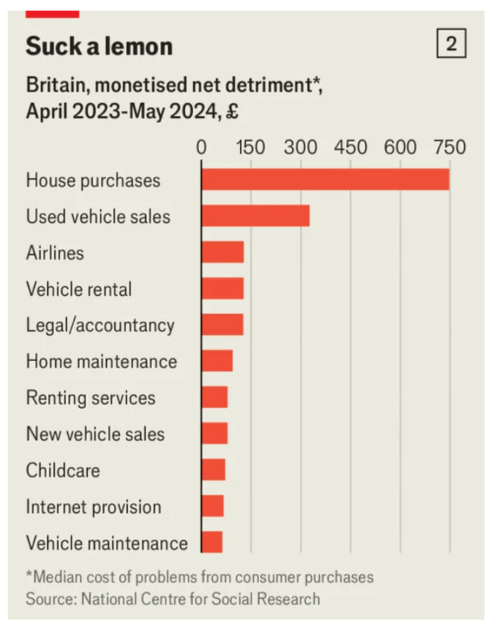 아까 얘기했던 중고차 레몬 경제학 이론을 빗대어, 위의 표는 영국의 경우 어느 분야에 헛돈이 가장 많이 나가고 있는가를 조사한 내용입니다. 주택 구입시 대략 150만원 (750 pound), 중고차가 그 다음으로 아직도 사탕발림에 꼬여 한 60만원 정도 지갑에서 새어 나가고, 항공권, 렌트카, 법률/회계 관련, 집수리 등이 그 뒤를 잇고 있군요. 이런 부분에 어떻게 AI를 활용할까요? 예를 들어 주택 구입시 계약서 PDF를 chatGPT(이코노미스트는 Claude에서 테스트)에 올려 계약 문건 점검해 달라 할 수도 있겠어요. 지난 번 AI 기사때도 말씀 드렸듯이, 내 컴속에, 내 폰 속에 박사급 두되가 내 명령만을 기다리고 있어. Awaken the Giant within!