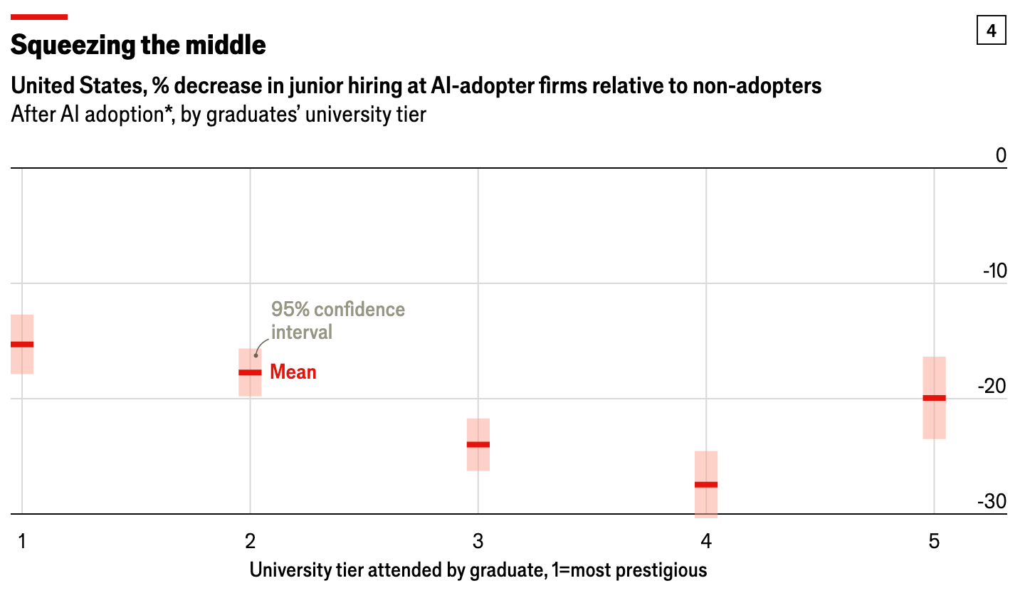 이번에는 좀 더 구체적으로, AI 도입 기업의 신규 채용율을 대학교 순위 그룹별로 통계 내린 그래프 보기로 합니다. 역시 미국 예 인데요, 아래의 X축이 대학교 순위 그룹: 즉 1 = 최상위 학교, 5는 고만고만한 학교. Y축은 신규 채용 하락율. 보시면 중간 그룹이 쥐어 짜지고 있네요. 무슨 뜻인고: 최상위 학교들은 AI대신 니 두뇌를 사겠어, 기업들이 흔쾌히 고용하고, 고만고만 학교는 그래 니네들 싼 값에 붙여주마 와서 AI로 재탄생하라우, 이런 뜻입니다. 갈 곳 없는 중위권 그룹은 음… 여친이랑 돈 모아 주유소 옆에 올리브영 대리점 하나 내 봐, 대박 날거야ㅎㅎ 참고로 미국 학교 그룹 순위(tier)는 구글에서 쳐 보니 대략 이렇게 나옵니다 (링크 - https://www.cosmic.nyc/blog/tiers-of-us-colleges)
