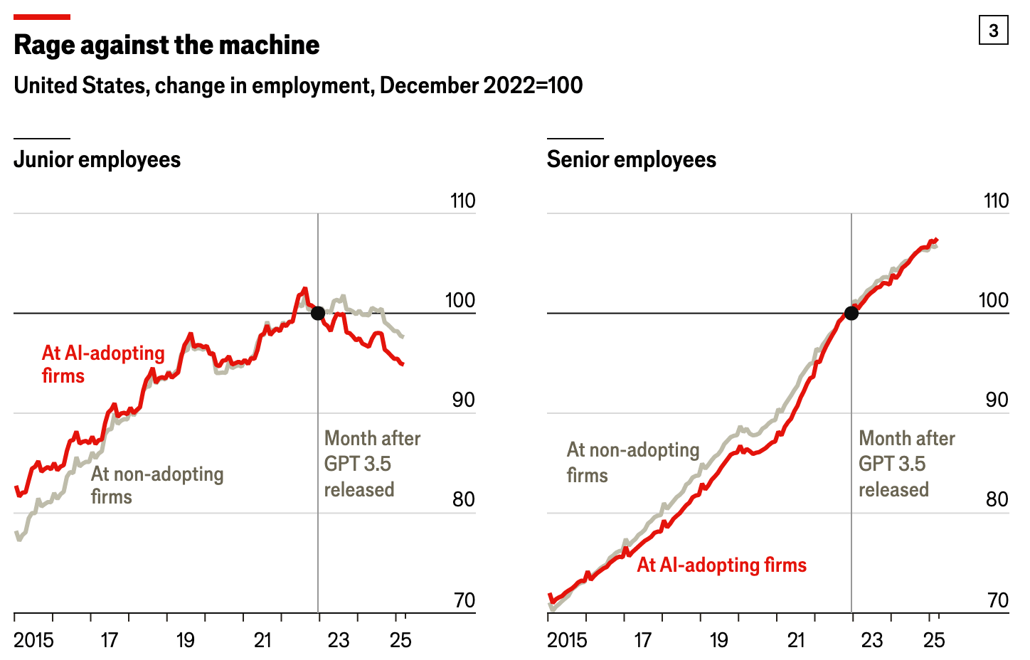 수다 접고 다시 AI 얘기로 돌아옵니다. 이번에는 요즘 한 번씩 들으셨을, AI가 갉아먹고 있다는 신규 채용직. Fact Check 한번 해 보겠습니다. 아래표 왼쪽은 신규채용, 오른쪽은 중견사원 채용. 그래프의 빨간선은 AI를 도입한 기업이고 회색은 도입하지 않은 기업. 그래프의 핵심은 왼쪽, 신규채용시 AI 도입기업은 채용율이 눈에 띄게 줄고 있긴 하네요. 미국의 예 입니다만.