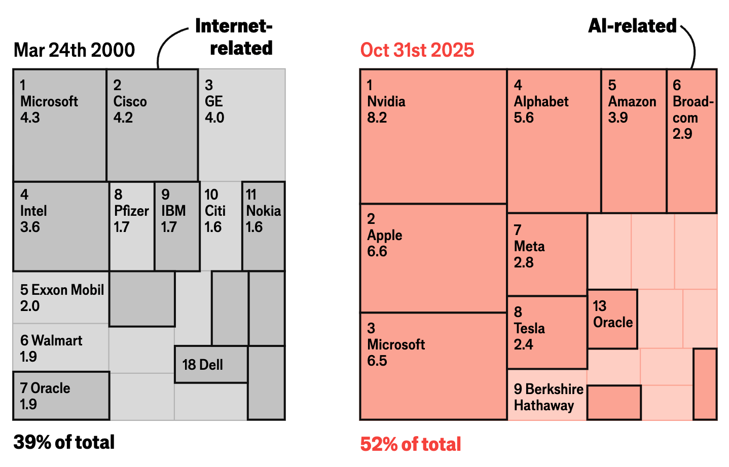 다음 표. 2000년 3월과 지금, S&P 500의 상위 20개 회사 중, 당시 닷컴으로 분류되는 회사가 왼쪽 진한 회색, 그리고 현재 AI계로 분류되는 회사가 오른쪽 진한 오렌지. 25년 전과 비교했을 때, 한 섹터로의 편중도가 52%로 과거 39%보다 높으므로 AI가 흔들리기 시작하면 서학개미떼들 단체로 줄초상입니다.