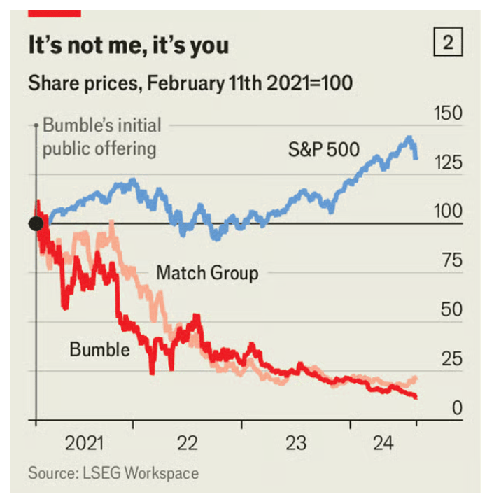 위의 표는 데이팅 앱 회사들의 주가 추이. Match Group은 틴더의 모(母)회사입니다. 떨어지는 매출은 유료회원의 감소와도 관련있는데 Match Group의 앱 중 하나인 Hinge에서는 남자가 상대방 여자에게 관심 있어요~ 메세지를 보낼 때 e장미를 선물할 수 있게 하는데 요게 $4이래요. 누가 내나요… Tinder의 경우는 아예 한 술 더 떠서, 아마 사용자 분들 경험하셨겠지만 스크롤 스크롤 해도해도 맘에 드는 애가 안 나와, 넷플릭스 유튜브 찾다 찾다 안 나오는 것처럼 스크롤로 한 바퀴 다 돌았네, 허비하는 시간을 줄여드리고자 특별 회원 서비스! 매칭 될 때까지 무제한 소개팅 같은 것이 있는데 이거는 한 달에 $500이네. 가격 너무 하잖아요.