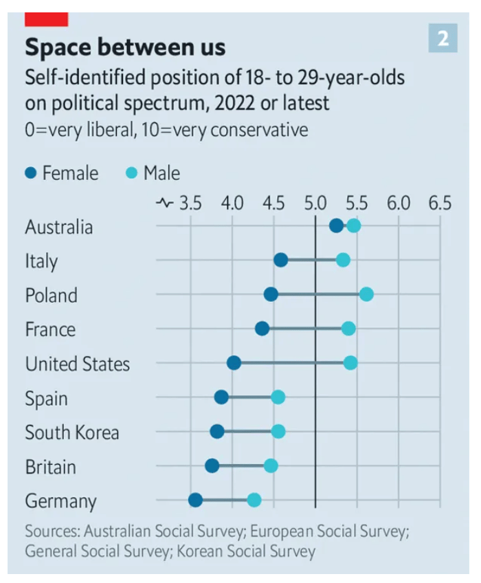 관련 그래프 하나 더. 역시 18-29세의 남녀간 정치 성향 차를 국가별로 보여줍니다. 호주가 의외로 보수적이네. 반면 South Korea 여성들은 유럽이나 미국보다 더 진보적이야! This suggests to me: 만일 여자 대학생들과 얘기할 기회가 있으면 아주 신중해야겠구나. 나 때는 말이야~ 로 시작하는 순간 커뮤니케이션 종료되겠구나. 염두에 두겠습니다.