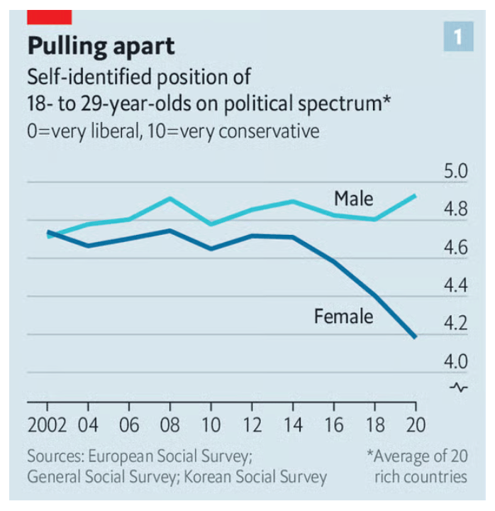 위의 표: 18-29세 정치 성향도. 선진 20개국 조사 자료인데 흥미롭다, 한국 사회 조사 기관도 자료 제공자로 되어있네. 표의 남자들은 보수 일변도인데 반해 여자들은 점점 더 진보를 향해 달려가는군요. 여성 학력 증가가 당연히 관련 있겠지요.. 라고 생각했는데 이건 이미 우리 사촌 큰 누나 세대에 일어났고, 이코노미스트에 따르면 post-feminisim을 바라보는 지금의 시각에서, 여성의 역할과 지위, 소득 격차 등의 부문에 관해 아직도 갈 길이 멀다고 생각되어 여성들은 진보에 대한 갈증을 시사하고 있다고 봐야 하겠습니다.