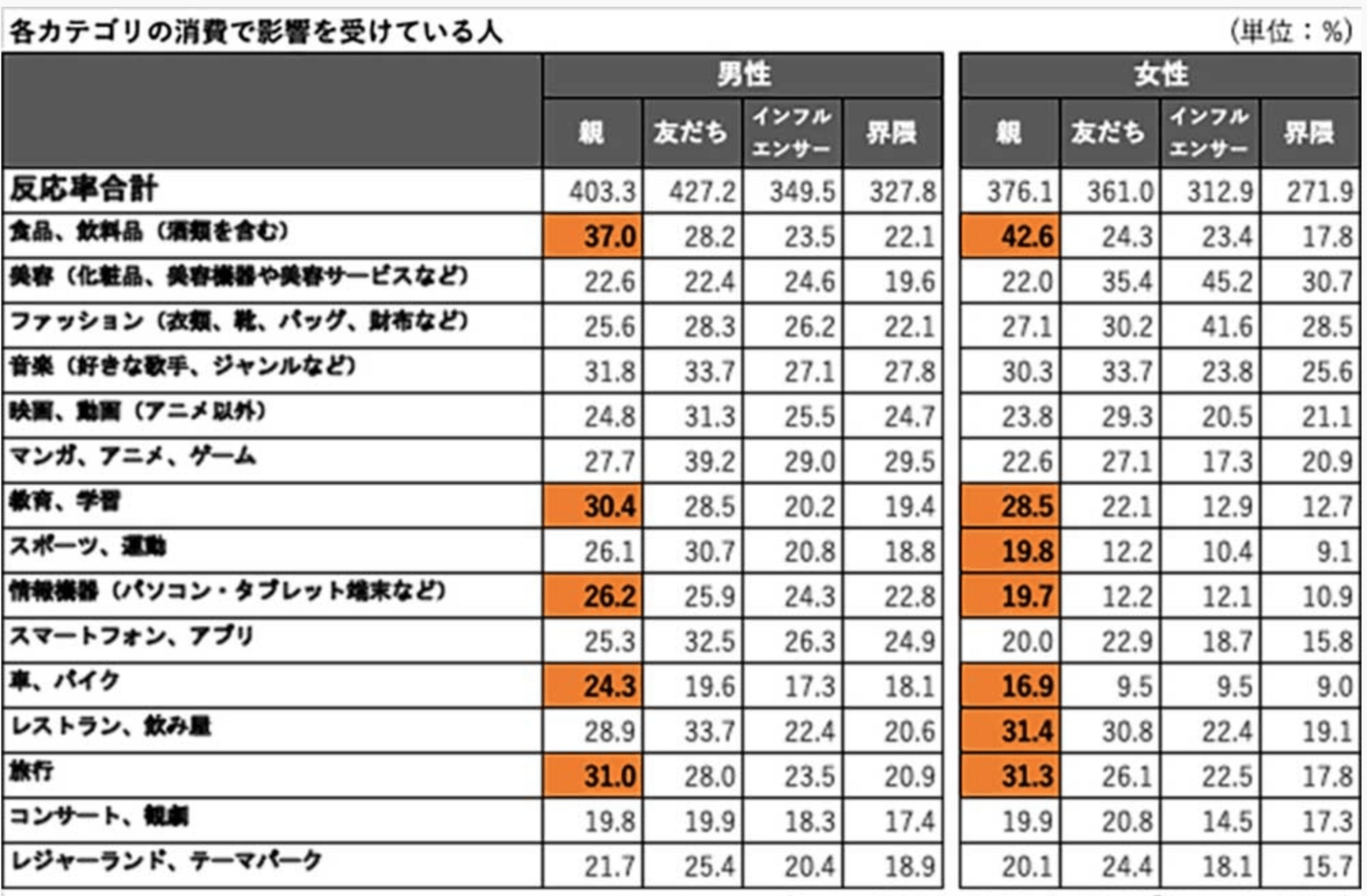 소비 카테코리별로 영향을 준 사람: 부모, 친구, 인플루언서, 또는 커뮤니티. 오렌지 색으로 표시된 부분이 다른 그룹에 비해 부모로부터의 영향 가장 큰 항목들인데요 다섯 개 보이지요? 위에서부터 번역하면 식품, 음료, 술이 37% / 교육, 학습 30.4% / 정보기기 (컴퓨터, 타브렛또 등) 26.2% / 차, 오토바이가 24.3% / 여행이 31% 입니다.