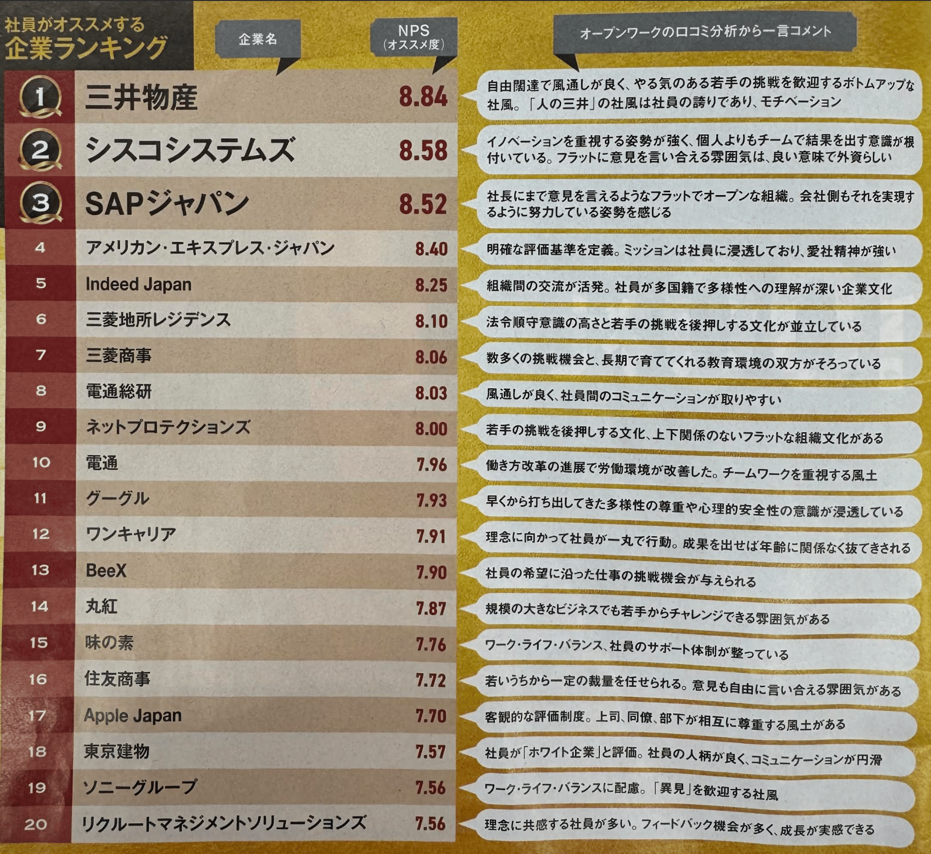 닛케이 비지니스 기사는 여기까지고요. 이번 호 일본 관련 특집이니 최근에 도서관에서 찍어 둔 몇 몇 관련 자료들 함께 소개합니다. 먼저 아래 표는 재직중인 사원들이 추천하는 기업 랭킹. 1위 부터: 미쯔이 물산 / Cisco / SAP Japan / American Express Japan / Indeed Japan(구인구직) / 미쯔비시 레지던스(부동산) / 미쯔비시 상사 / 덴쯔(電通) 종합 연구소 (Marketing) / 넷또프로텍숀즈(지불 결제 시스템) / 덴쯔(電通) / Google / 원 캐리어(구인구직) / BeeX(클라우드 소프트웨어) / 마루베니 / 아지노모토(식품) / 스미토모 상사 / Apple / 도쿄건물 (부동산) / Sony Group / Recuit Management Solutions. 외국 기업 이름은 다 아실테고. 기술 중심이네요. 그리고 빨간색이 종합상사들. 우리나라로 치면 예전 80-90년대 전세계 5대양 6대주를 누비며 돈 되는 건 다 팔아~ 삼성물산, 대우 인터네셔널 같은 회사입니다. 참고로 아래 표 오른 편의 코멘트를 읽어보면 자유 / 도전 / Motivation / Teamwork / 평등한 기업문화 / Openness / 투명성 / 애사심 / Mission-driven / 인종 다양성 (Diversity) / 인재 육성 / 장기적 마인드 / Communication과 같은 키워드들이 보입니다.