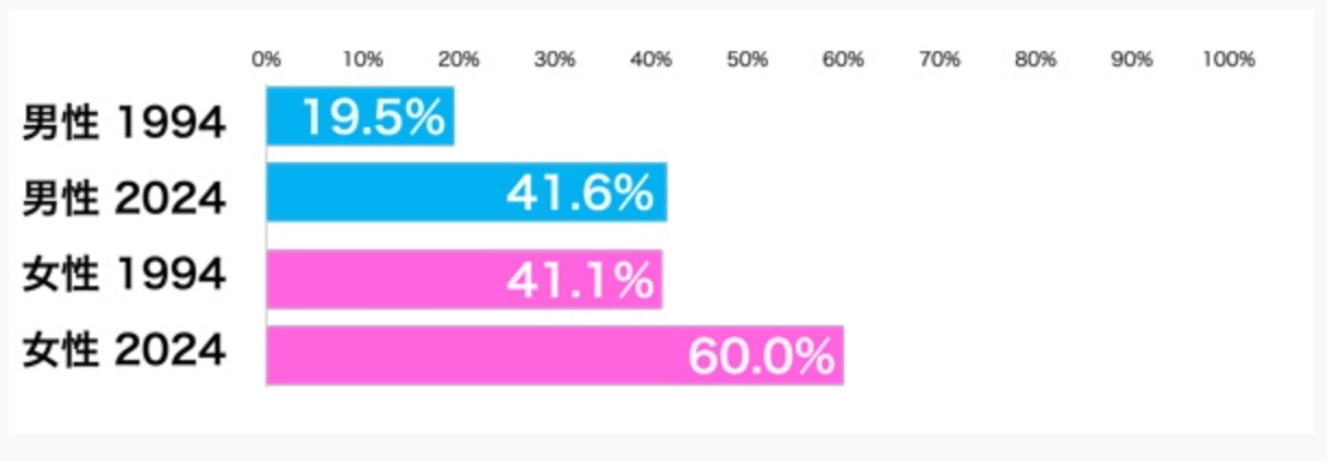 마케팅 조사기관인 하쿠호도(博報堂) 생활 총연구소에서 조사한 내용입니다. 1994년과 2024년, 30년 간극을 두고 ‘부모와 공통된 취미가 있는가’를 물었습니다. 여자의 경우가 압도적이군요. 2024년, 대학나온 엄마들은 이제 다년간의 회사 경험과 거기서 얻어진 인생 노하우 및 (특히) 패션 센스를 딸과 공유합니다. 그래서 쇼핑은 바로 쉽게 공통적 취미가 될 수 있겠네요.