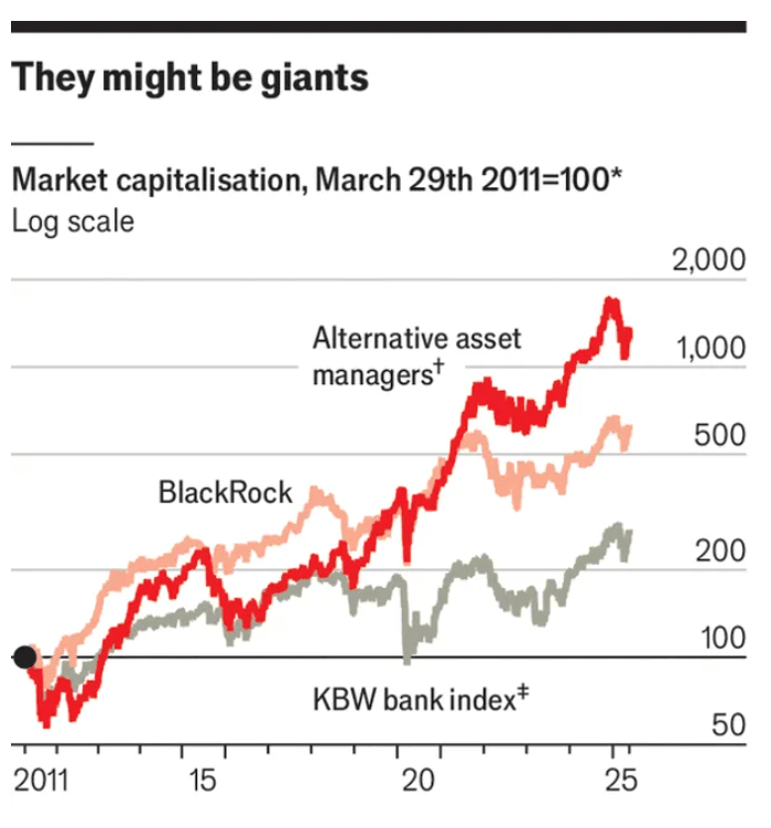 우선 그래프부터. 아래 보시면 2011년 이후 BlackRock을 필두로 한 대체자산(Alternative asset) 관리 금융 업체들이 은행에 비해 크게 다섯 배의 수익을 올리고 있습니다. 시간을 거슬러 올라가, 2008년 금융위기 다 기억하시죠. 그 때 미국을 비롯한 전세계 경제 크게 한 번 휘청했잖아. 아 기억난다. 그 때 호주에 살았는데 이직할려고 이력서를 한참 뿌렸지. 아마 한 200개 돌렸을거야. 한 채용업체의 에이전트가 내 이력서를 보더니 철자가 틀렸다고 구박주면서 야 니 지금 금융위기로 얼마나 힘든지 아냐, 이력서 제대로 안쓰면 지금 같은 때는 바로 탈락이다, 하더라. 호주에도 여파가 이 정도였으니 진앙지인 미국은 더 크게 흔들렸었겠지요. 기업 구제에 들어가면서, 미국 정부는 금융권 규제를 더 철저히 하게 되는데 이로 인해 은행과 비은행 간의 규제 정도에 차이가 생기게 되었답니다. 즉, 상대적으로 비은행권은 규제를 덜 받게 된 것이죠. 아래 그래표의 2011년 출발점은 그래서 의미가 있는데 이 때에 Apollo라는 또 하나의 대체자산 관리회사가 상장을 하던 시점이었대요.