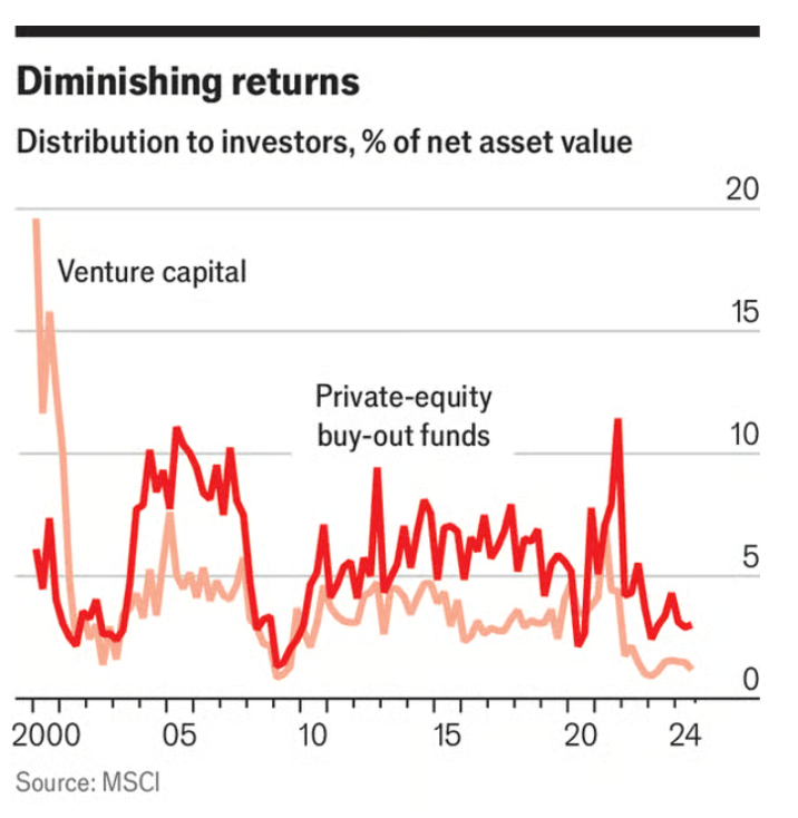 뻘소리 접고 다시 이코노미스트 기사로 돌아왔습니다. 사모펀드와 벤처 캐피탈이 대체자산의 범위에 들어가지 아리까리합니다만 사모펀드(Private Equity, 정확히는 사모 주식이지만 편의상 사모펀드로 번역) 업계를 다루는 기사에서 위에 말씀드렸던 KKR이 다시 등장했습니다. KKR, KKR … KKK? 음 이미지 별로 안 좋네. 그 이미지 대로 KKR은 종종 적대적 인수합병으로 돈을 꽤 벌었답니다. 그러나 수익률은 최근들어 형편없군요.
