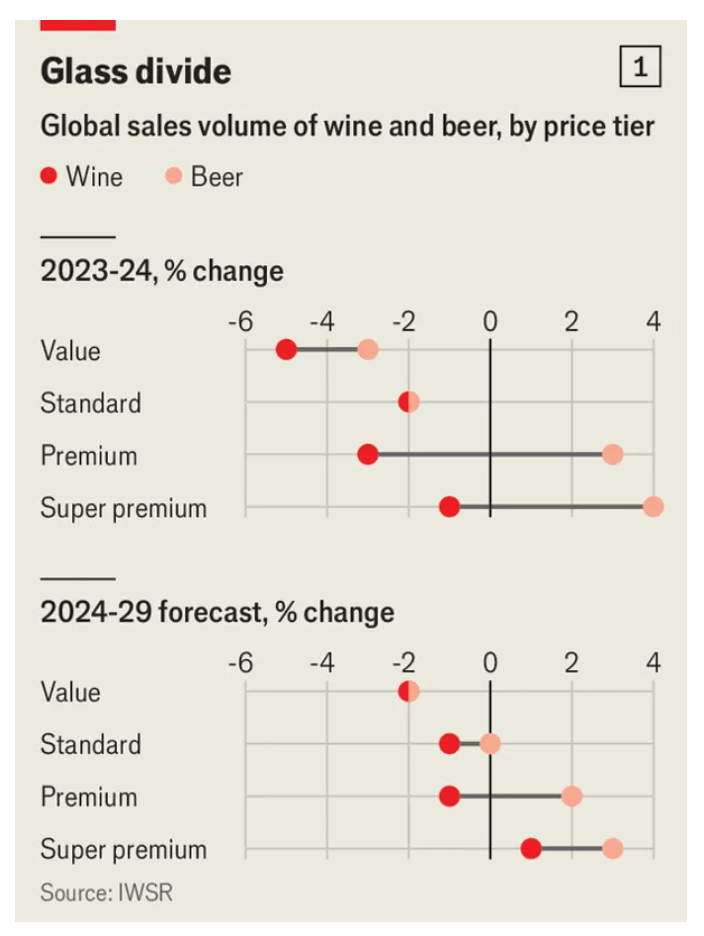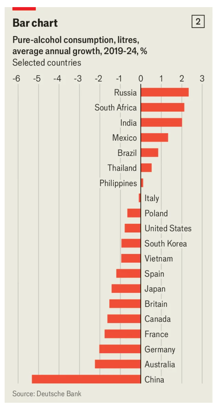 그렇다고 전 세계가 다들 고독한 절주 미식가가 되어 술을 피하는 것 같지는 않군요. 서양 + 동아시아 선진국은 노령화와 저출산의 여파가 음주 소비 문화에 상대적으로 크게 작용함을, 아래 표의 술 소비량 증가도에서 알 수 있을 것 같어요. 다만 중국은 선진국 아님에도 예외: 코로나때 도시 봉쇄하여 음주 욕구의 씨를 말려놨어요. 그리고 다들 1가구 1자녀들이잖아. 자 이제 코로나 풀렸어 얘들아 술 다시 마셔도 돼, 노올자~ 했지만 그 몇 년 사이, 리얼 월드에서 어떻게 소통하는지 다들 방법을 잊어먹었나봐, 표의 통계로 해석하자면. 반면 개발 도상국은 아직 젊은 인구들 많아, 그리고 매일 매일 주머니가 두둑해져가고 있으니 편의점 앞에서 오징어다리에 소주 마실거면 호프집 치맥 정도는 낼 수 있게 된 것이지요. (베트남이 이런 점에서 또 예외인데, 왜 소비량이 줄었는가 모르겄시유.)