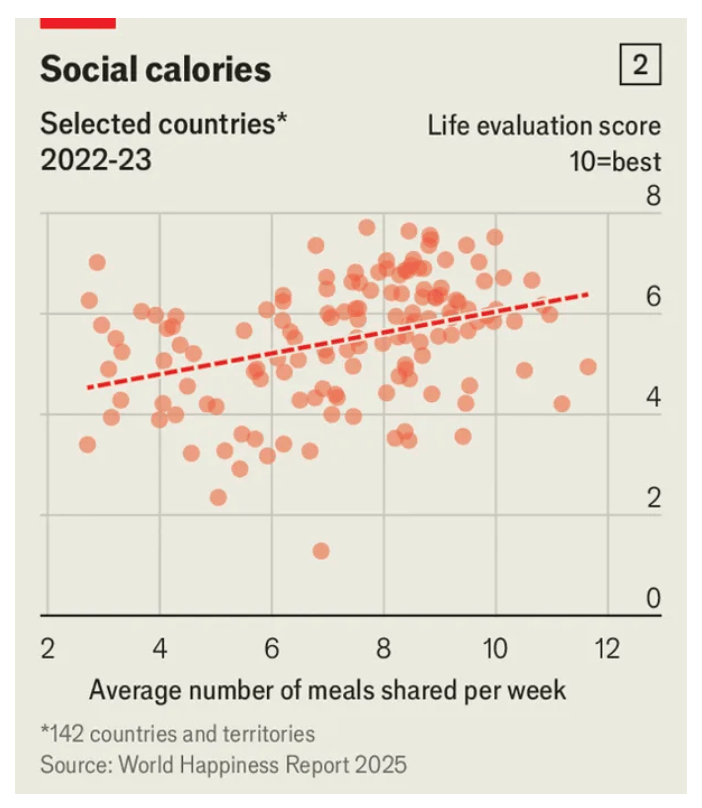 작년 6월 1일자 뉴스레터(링크 - https://seoultokyo.beehiiv.com/p/can-money-buy-happiness-8ffa) 에서도 말씀 드렸듯이 Anti-혼밥과 행복도는 대체로 비례합니다. 아래 그래프에서 같은 내용 반복됩니다(편의상 Anti-혼밥 = Meal sharing = 함밥, 즉 합께 밥으로 지칭합니다). 가로축 Meal share 일주일에 몇 번, 그리고 세로축이 인생 만족도. 기사에 따르면 파트너와 같이 사는 것은 규칙적으로 헬스장 가서 운동하는 것과 같은 정도의 장수 효과가 기대되고요, 또 정기적인 가족 방문, 그리고 이건 좀 웃기네, 나 사실 말이야... 이거 너만 알고 있어, 를 고백할 누군가를 두고 있으면 이것도 장수의 첩경이랍니다.